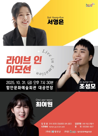 [뉴스다컴] 함안군은 조성모·서영은·최여원이 함께하는 ‘라이브 인 이모션(Live in Emotion)’ 콘서트가 오는 10월 31일 오후 7시 30분 함안 문화예술회관 대공연장에서 개최된다고 밝혔다.