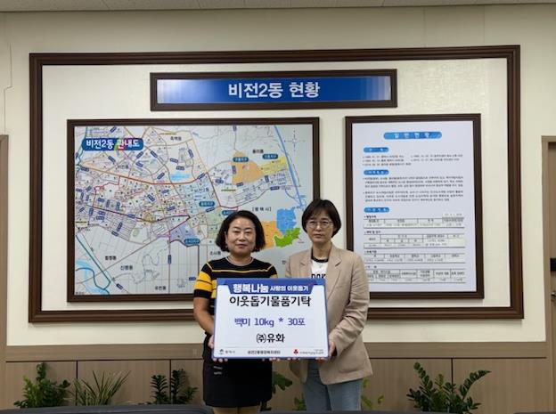 [뉴스다컴] ㈜유화는 추석 명절을 맞아 지난 29일 비전2동 행정복지센터를 방문하여 100만원 상당의 백미 30포를 전달하며 온정을 베풀었다.