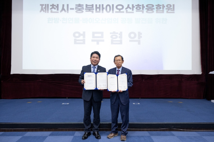 [뉴스다컴] 제천시는 9월 30일 ‘2025 제천국제한방천연물산업엑스포’ 기간 중 한방생명과학관 다목적강당에서 충북바이오산학융합원과 한방·천연물산업 발전을 위한 업무협약(MOU)을 체결했다.