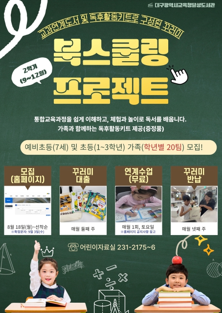 [뉴스다컴] 대구달성도서관은 9월부터 12월까지 창의적 사고력과 공동체 역량을 키우는 독서활동 꾸러미 프로그램 ‘북스쿨링’을 운영한다.