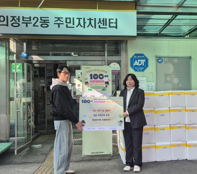 [뉴스다컴] 의정부시 의정부2동주민센터는 11월 12일 한국마사회 의정부지사가 ‘100일간 사랑릴레이 배턴 잇기’에 동참해 성금 450만 원을 기부했다고 밝혔다.