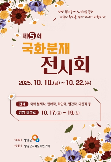 [뉴스다컴] 양양군 국화분재연구회(회장 윤종욱)는 오는 10일부터 22일까지 13일간 양양군농업기술센터에서 ’제5회 국화분재 전시회‘를 개최한다.