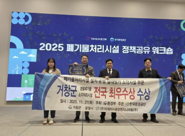 [뉴스다컴] 거창군은 지난달 27일 기후에너지환경부가 주관하고 한국환경공단이 시행한 2025년 폐기물처리시설 운영·실태 평가에서 전국 최우수시설로 선정됐다.