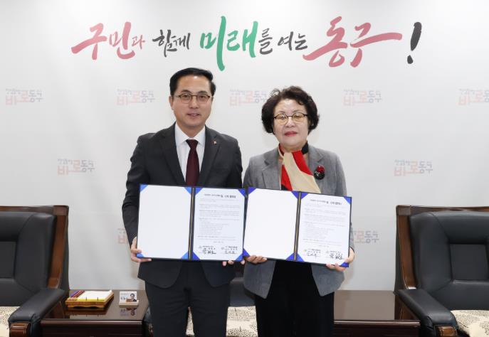 ▲ 위수탁 협약 체결 모습(왼쪽 박희조 동구청장, 오른쪽 김경옥 이사장)