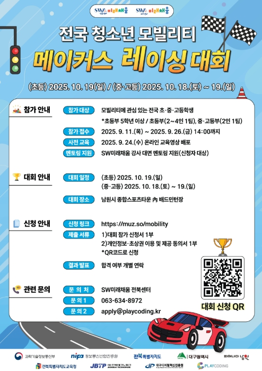 [뉴스다컴] 남원시가 오는 10월 18일부터 19일까지 남원종합스포츠타운 내 배드민턴장에서 ‘SW미래채움(전북) 전국 청소년 모빌리티 메이커스 레이싱 대회’를 개최한다.