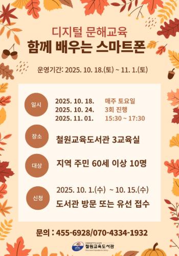 [뉴스다컴] 철원교육도서관은 지역 고령층의 디지털 활용 능력 향상과 격차 해소를 위해 오는 10월 18일부터 11월 1일까지 매주 토요일, 총 3회에 걸쳐 ‘함께 배우는 스마트폰’ 디지털 문해교육을 운영한다.