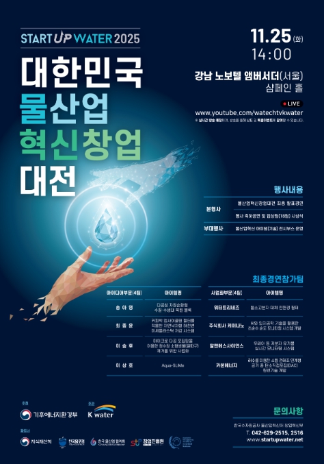 [뉴스다컴] 기후에너지환경부와 한국수자원공사는 물산업을 우리나라의 새로운 성장동력으로 성장시킬 ‘혁신형 고성장 기업(유니콘)’을 발굴하기 위해 11월 25일 노보텔앰버서더호텔(서울 강남구 소재)에서 ‘대한민국 물산업 혁신 창업대전 2025’ 최종 경연을 개최한다고 밝혔다.