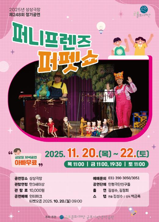 [뉴스다컴] 군포문화재단 군포시평생학습원 상상극장은 오는 11월 20일부터 22일까지 정기공연으로 인형극 ‘퍼니프렌즈 퍼펫쇼’를 무대에 올린다.