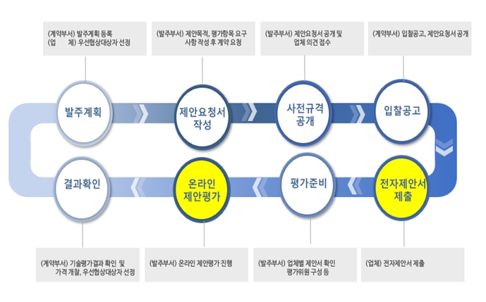 이번 온라인 평가는 PDF 제출 + 화상회의 발표를 결합한 전자적 방식으로 진행된다. 조달청 온라인 평가시스템을 활용해 사업부서는 사업 특성과 목적물의 속성에 맞춰 대면·온라인 방식을 자율적으로 선택할 수 있다. 입찰 공고 후 업체가 평가자료를 온라인으로 제출하면 평가위원회가 시스템상에서 정성평가를 진행한 뒤 결과를 확정하여 계약을 체결한다.