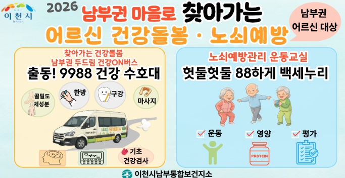 [뉴스다컴] 이천시는 남부권 어르신을 대상으로 의료 접근성을 높이기 위한 ‘출동! 9988 건강수호대’와 운동교실에 노쇠예방관리를 접목한 ‘헛둘헛둘 88하게 백세누리’ 사업을 2026년 본격 운영한다.