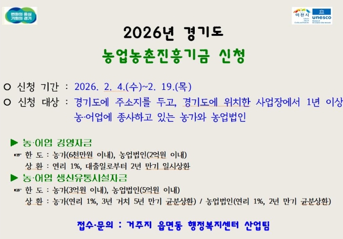 [뉴스다컴] 이천시는 농업인에게 장기·저리 융자 지원을 실시하고 경영안정을 돕기 위해 2026년 경기도 농업농촌진흥기금 농어업 경영자금, 농어업 생산유통시설자금 사업에 대한 신청을 2월 3일부터 접수한다.