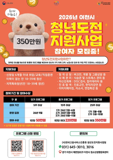 | ▲ 이천시, 청년도전지원사업 참여자 모집… 최대 350만 원 참여수당 지급 |