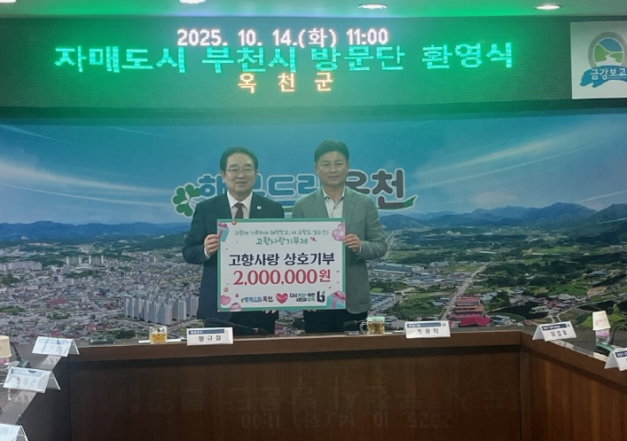 [뉴스다컴] 14일, 조용익 부천시장을 비롯한 부천시 충청권 정책현장 벤치마킹 방문단 24명이 ‘향수의 고장’ 옥천군을 방문했다. 이번 만남은 2002년 자매결연을 체결한 두 지역 간의 우호 증진과 교류 확대를 위한 자리로 마련됐다. 이날 옥천군과 부천시는 각 200만 원의 고향사랑기부금을 상호 기탁하며 두 지역의 발전을 함께 응원했다.