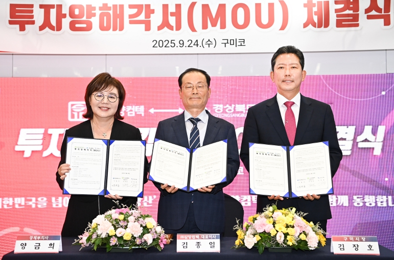 [뉴스다컴] 구미시는 9월 24일 구미코 경북라운지에서 2025 항공방위물류박람회(GADLEX) 개막 행사 전에 양금희 경상북도 경제부지사, 김장호 구미시장, 박교상 구미시의회 의장, 김종일 대표이사 등이 참석한 가운데 ㈜삼양컴텍와 경상북도·구미시 간 투자양해각서(MOU)를 체결했다.