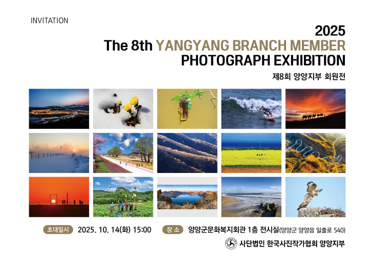 올해로 8회째를 맞는 이번 회원전은 사진 예술이 군민들에게 편안하고 가까이다가 갈 수 있도록, 양양문화복지회관 1층 전시실에 30점의 회원 작품들을 선보이며 양양의 다채로운 매력을 뽐낼 예정이다.