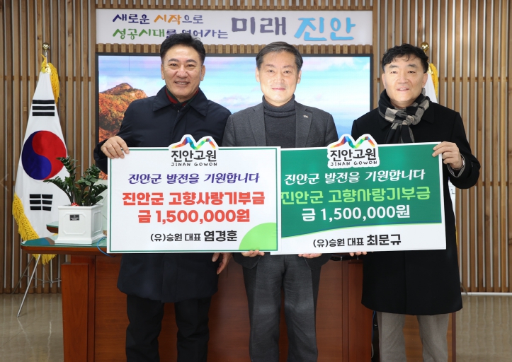 전춘성 진안군수는 “꾸준히 진안을 위해 따뜻한 마음을 전해주시는 염경훈·최문규 대표님께 깊은 감사의 뜻을 전한다”며, “기탁해주신 소중한 기부금은 진안군민의 복리 증진과 지역 발전을 위해 소중히 사용하겠다”고 전했다.