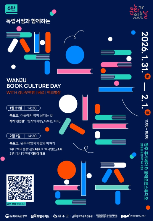 [뉴스다컴] 완주문화재단은 오는 1월 31일부터 2월 1일까지 이틀간 완주 휴시네마와 공예오픈스튜디오에서 '문화가 있는 날 6탄 – 책으로 잇는 완주'를 개최한다.