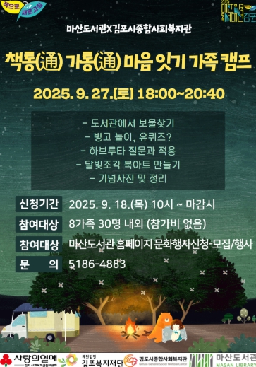 [뉴스다컴] 김포시 마산도서관에서 오는 9월 27일 오후 6시부터 ‘책통(通) 가통(通) 마음 잇기 가족 캠프’를 운영한다.