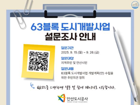 이번 설문조사는 63블록 개발계획(안)에 안산시민과 지역주민의 의견을 적극 반영하고자 마련됐다. 수렴된 의견은 향후 도시개발계획 수립에 중요한 기초자료로 활용될 예정이다.