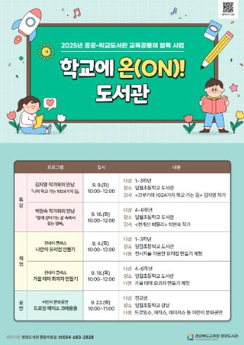 [뉴스다컴] 경상북도교육청 영양도서관은 공공도서관과 학교도서관의 연계를 통해 도서관 이용 활성화와 독서문화진흥을 도모하고자 공공-학교도서관 교육공동체 협력 사업 '학교에 온(ON)! 도서관' 프로그램을 운영한다.