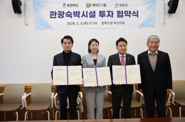 [뉴스다컴] 충북 보은군은 3일 충북도청 여는마당에서 충청북도·라미드관광㈜과 ‘구병산관광지 관광숙박시설 및 부대시설 조성사업’을 위한 투자협약(MOU)을 체결했다.