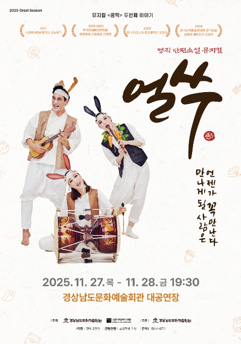 [뉴스다컴] 경남문화예술회관은 27~28일 양일간 오후 7시 30분 대공연장에서 국립아시아문화전당재단 제작한 뮤지컬 쿵짝 두번째 이야기 – 얼쑤 공연을 개최한다고 밝혔다.