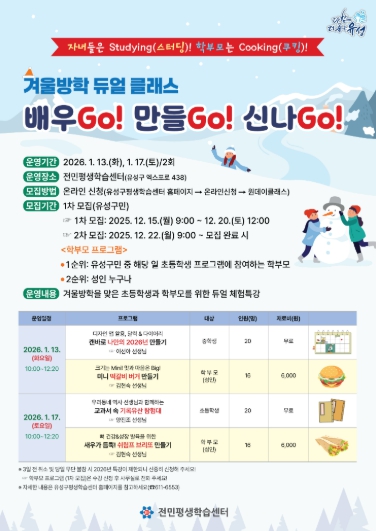 [뉴스다컴] 대전 유성구는 전민평생학습센터에서 1월 13일과 17일 양일간 초·중학생과 학부모를 위한 체험형 프로그램 ‘듀얼 클래스, 배우GO! 만들GO! 신나GO!’를 운영한다.