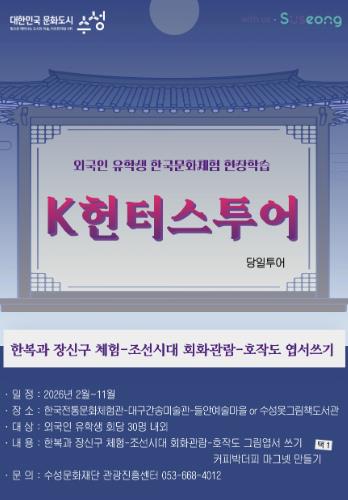 [뉴스다컴] 대구 수성문화재단은 올해 2월부터 11월까지 대구·경북 외국인 유학생을 대상으로 한국문화체험 현장학습 ‘K헌터스 투어’를 운영한다.