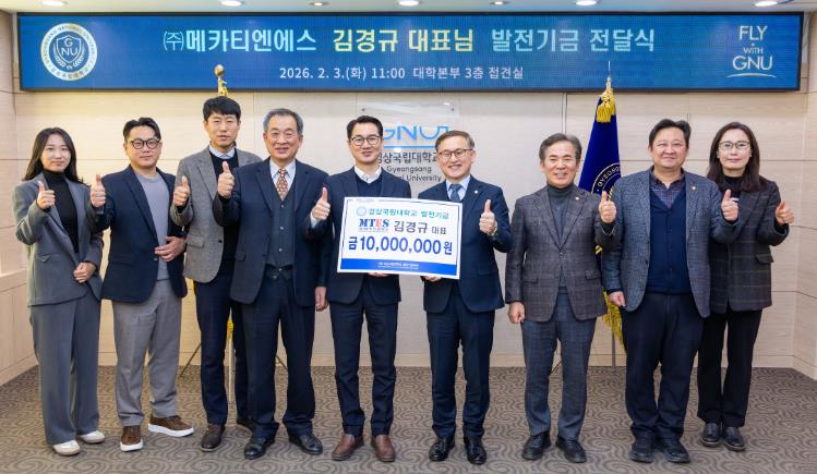 [뉴스다컴] 경상국립대학교는 2월 3일 오전 11시 대학본부 3층 접견실에서 ㈜메카티엔에스 김경규 대표가 대학발전기금 1000만 원을 기부했다고 밝혔다.