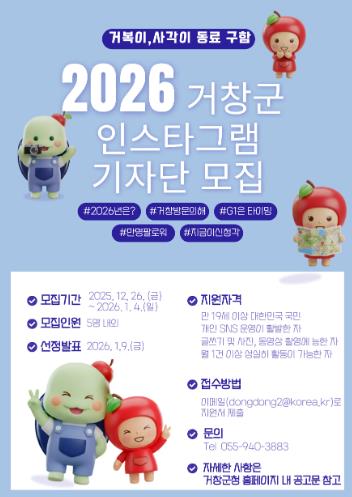 [뉴스다컴] 거창군은 지역 관광자원의 매력을 생생하게 전달하고 온라인 홍보를 강화하기 위해 ‘2026년 거창군 인스타그램 기자단’을 모집한다고 26일 밝혔다.