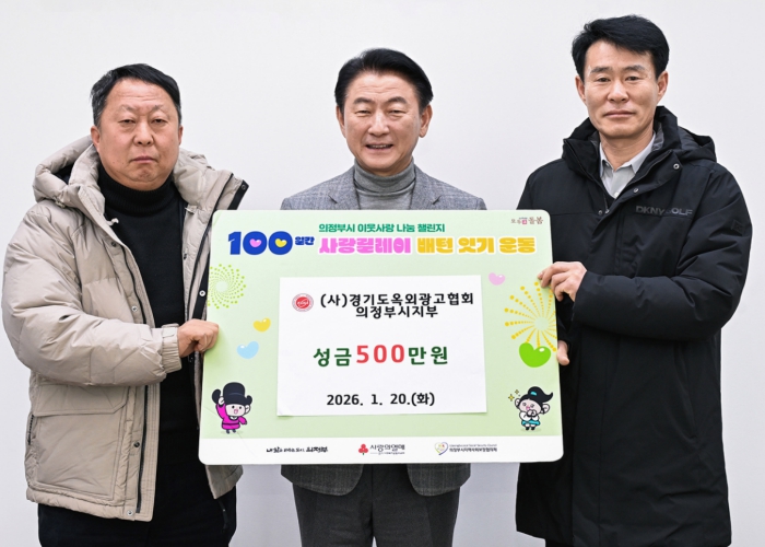 [뉴스다컴] 의정부시는 1월 20일 (사)경기도옥외광고협회 의정부시지부가 ‘100일간 사랑릴레이 배턴 잇기’에 동참해 성금 500만 원을 기탁했다고 밝혔다.