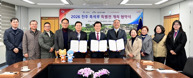 진주시는 15일 시청 5층 기업인의 방에서 ‘국립진주박물관’, ‘(사)진주목문화사랑방’과 '2026 진주 촉석루 특별전'의 개최를 위한 업무협약(MOU)을 체결했다고 밝혔다.