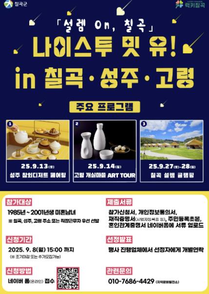 칠곡군 관계자는 “이번 행사는 3개 군이 협력하여 준비한 만큼, 청춘남녀들에게는 새로운 만남과 추억을 선물하고, 지역에는 활력과 긍정적인 에너지를 불어넣는 계기가 될 것”이라며 “앞으로도 청년들이 지역에 정착할 수 있도록 다양한 교류·문화 프로그램을 지속적으로 지원하겠다”고 말했다.
