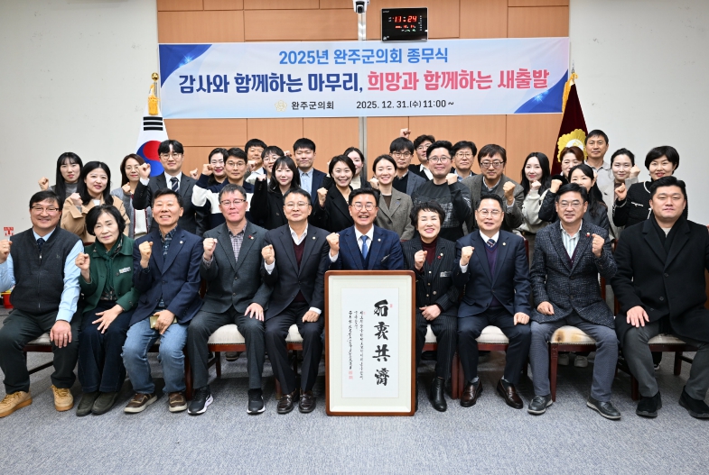 [뉴스다컴] 완주군의회는 31일 문화강좌실에서 11명 군의원 전원과 의회사무국 직원 등 40여 명이 참석한 가운데 2025년도 종무식을 개최했다.