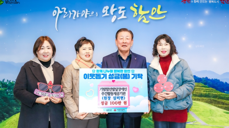 [뉴스다컴] 함안군은 지난 8일 가람함안발달장애인 주간활동제공기관이 ‘제6회 함안애(愛)복지박람회’에서 마련한 수익금 100만 원을 지역사회에 기부했다고 밝혔다.