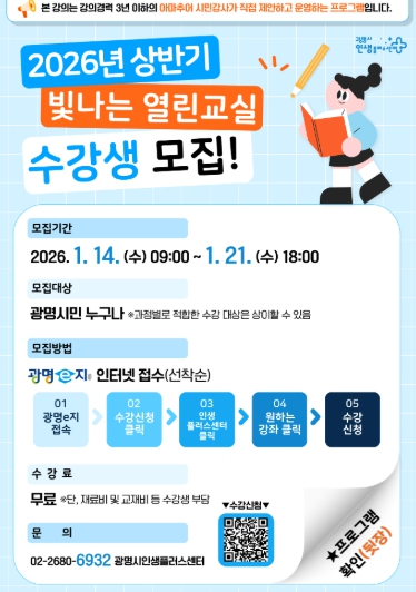 [뉴스다컴] 광명시 인생플러스센터는 오는 14일부터 21일까지 시민이 기획하고 운영하는 ‘2026년 상반기 빛나는 열린교실’의 수강생 230명을 모집한다.