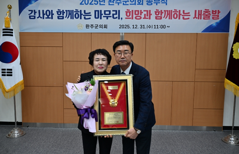 [뉴스다컴] 완주군의회 이경애 의원이 지난달 31일, 완주군의회 문화강좌실에서 열린 완주군의회 2025년도 종무식에서 전북 지방의정봉사상을 수상했다.