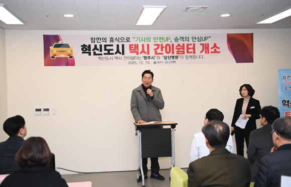[뉴스다컴] 원주시는 혁신도시 내 택시 종사자들의 근로 여건 개선과 복리 증진을 위해, 삼산병원에 ‘혁신도시 택시 간이쉼터’를 조성하고 10일 오전 11시 개소식을 열었다.