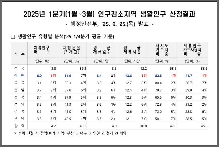 [뉴스다컴] 강원특별자치도는 행정안전부가 9월 25일 발표한 ‘2025년 1분기 인구감소지역 생활인구 산정 결과’에서 체류인구 총 2,826,012명으로 전국 최고 수준을 기록했다고 밝혔다.