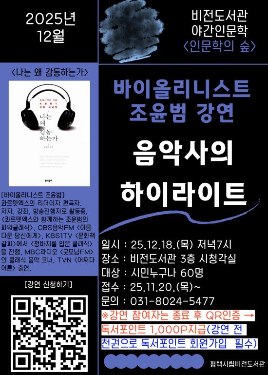 [뉴스다컴] 평택시립 비전도서관이 오는 12월 18일 저녁 7시 조윤범 바이올리니스트를 초청하여 ‘음악사의 하이라이트’를 주제로 야간 인문학 강연을 진행한다.