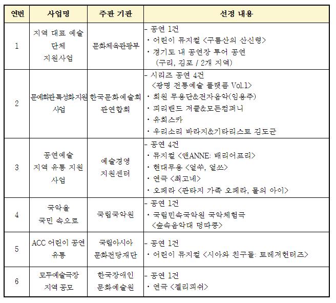 이번에 선정된 사업은 ▲지역 대표예술단체 지원 사업(문화체육관광부) ▲문예회관 특성화 지원 사업(한국문화예술회관연합회) ▲공연예술 지역 유통 지원 사업(예술경영지원센터) ▲지역 문화향유기회 확대를 위한 '국악을 국민 속으로'(국립국악원) ▲ACC 어린이 공연 유통(국립아시아문화전당재단) ▲모두예술극장 지역 공연 공모(한국장애인문화예술원)이다.