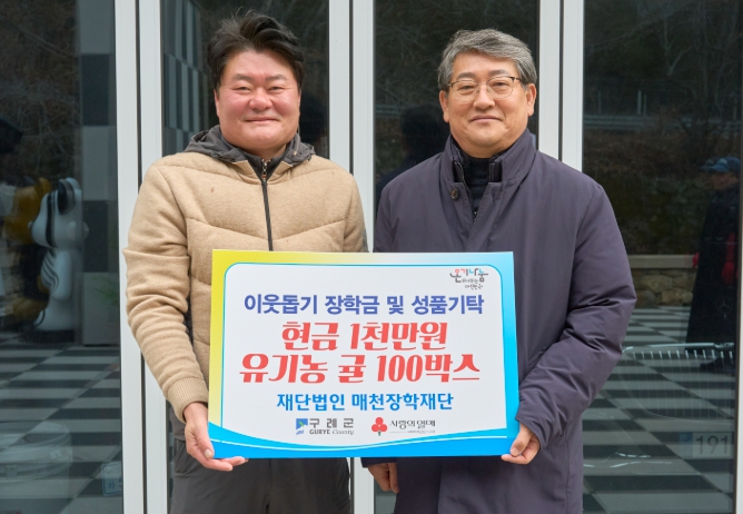 [뉴스다컴] 전남 구례군은 지난 14일, (재)매천장학재단(이사장 김용목)이 지역 내 저소득가정 학생들을 위한 장학금 1,000만 원과 유기농 귤 100박스를 기탁했다고 밝혔다.
