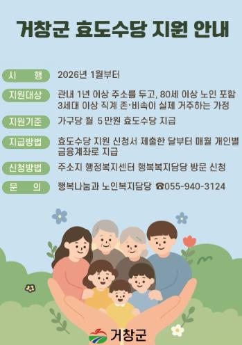한편, 거창군은 그동안 4세대 이상 동거하는 가구에 대해 효도수당을 지원해 왔으나, 효 문화 확산과 가족 돌봄 기능 강화를 위해 지난해 관련 조례를 개정하고 지원 대상을 3세대 동거가구까지 확대했다.