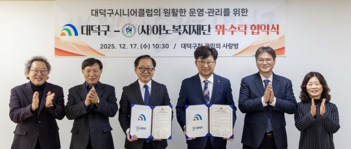 [뉴스다컴] 대전 대덕구는 17일 구청 구민의 사랑방에서 사단법인 아노복지재단과 대덕구 시니어클럽 위탁 운영 협약을 체결했다.