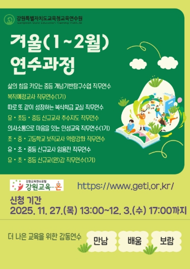 [뉴스다컴] 강원특별자치도교육청교육연수원은 11월 27일부터 12월 3일까지 2026년 겨울(1~2월) 연수 과정 신청을 진행한다.