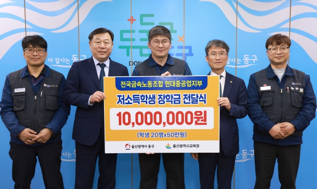 김종훈 동구청장은 “어려운 환경에서도 학업을 이어가는 학생들을 위해 따뜻한 마음으로 장학금을 기탁해주신 현대중공업지부에 깊이 감사드린다,”라며, “이번 장학금이 학생들에게 큰 용기와 희망이 되기를 바라며, 우리 구에서도 학생들이 꿈을 키워나갈 수 있도록 지속적으로 노력하겠다”고 말했다.