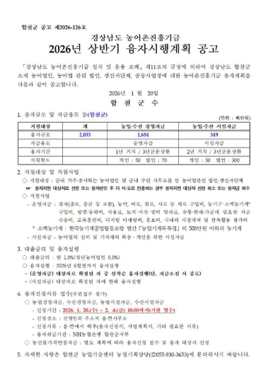 올해 합천군에 배정된 농어촌진흥기금은 20억 원 규모로, 농수산물의 생산·가공·유통·수출을 위한 운영자금과 설비 및 기자재 확충과 개선을 위한 시설자금으로 구분해 신청을 받는다.