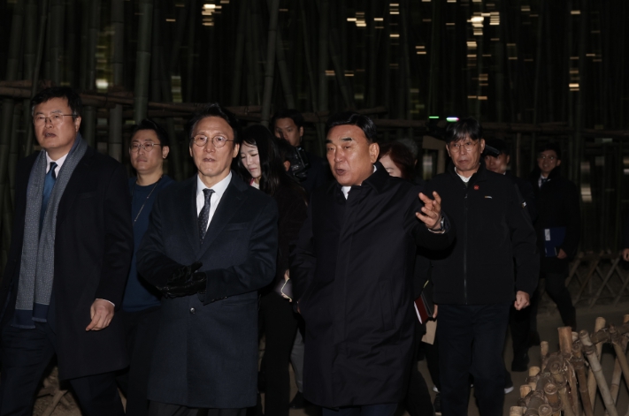| ▲ 김민석 국무총리가 19일 무장애 관광수용태세 점검차 울산시 중구 태화강 국가정원을 방문, 김두겸 울산시장과 십리대숲길을 걷고 있다. |