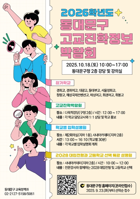 [뉴스다컴] 서울 동대문구는 오는 10월 18일 토요일 오전 10시부터 오후 5시까지 구청 내 다목적 강당, 제2회의실, 사내아카데미에서'2026학년도 고교 진학정보 박람회'를 개최한다고 밝혔다.