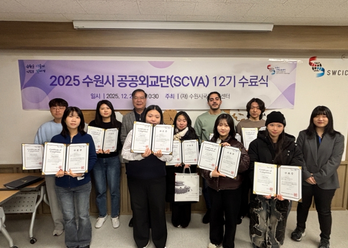 [뉴스다컴] 수원시국제교류센터가 22일 센터에서 ‘수원시 공공외교단(SCVA) 12기’ 수료식을 열고, 단원 16명에게 수료증을 전달했다. 우수활동자 4명에게는 상장을 수여했다.